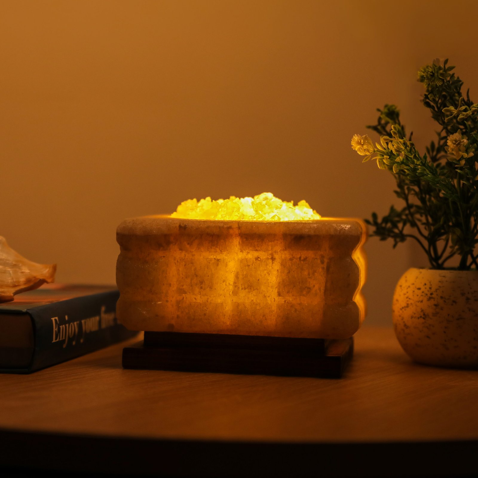 حالة لا مجرّد حضور؛ قطعة ديكور فريدة من الملح الصخري الطبيعي، بنورٍ دافئ وتوهّجٍ هادئ. يُضاف العطر على جوانبها لينساب بلطف في الأجواء، مانحةً إحساسًا بالهدوء والراحة.