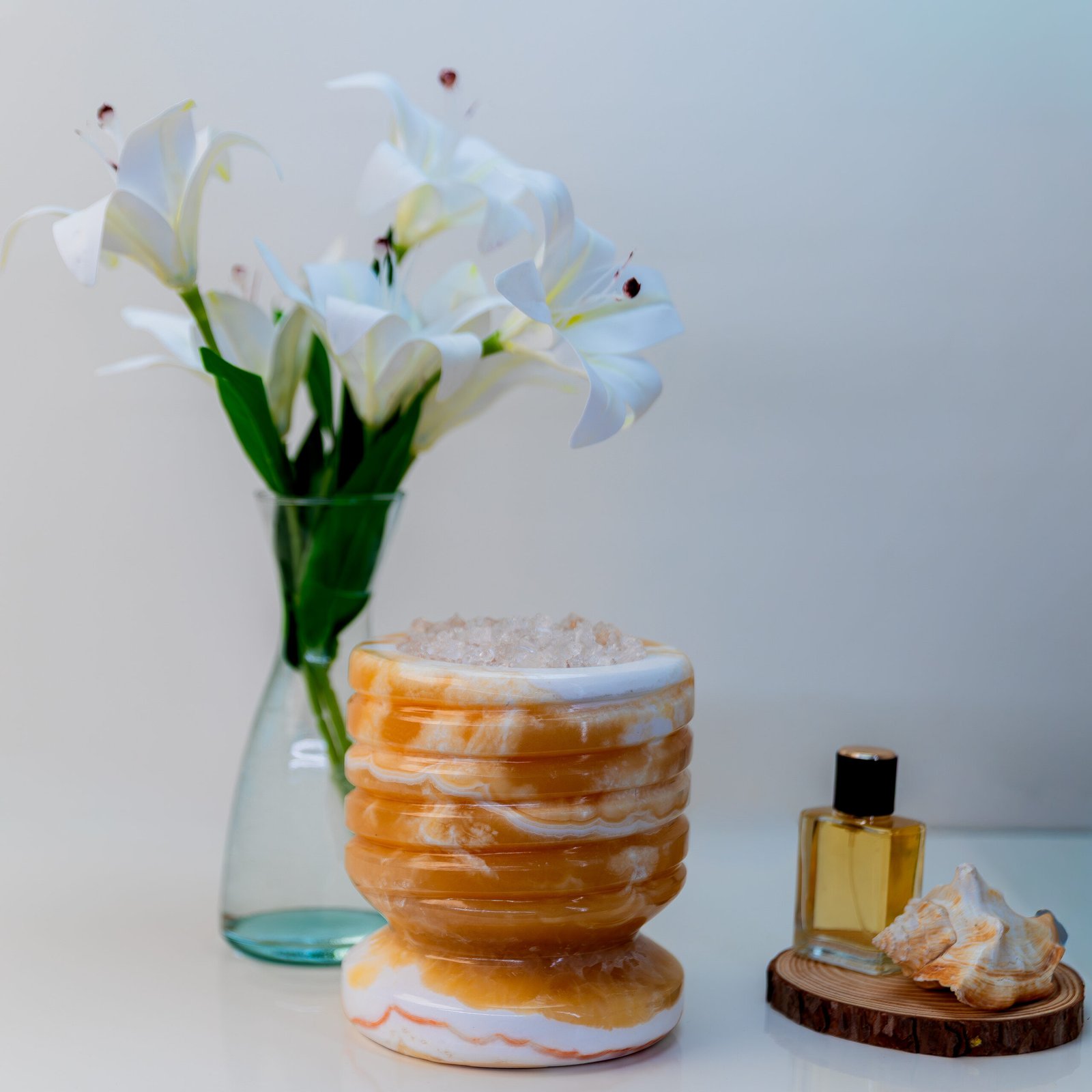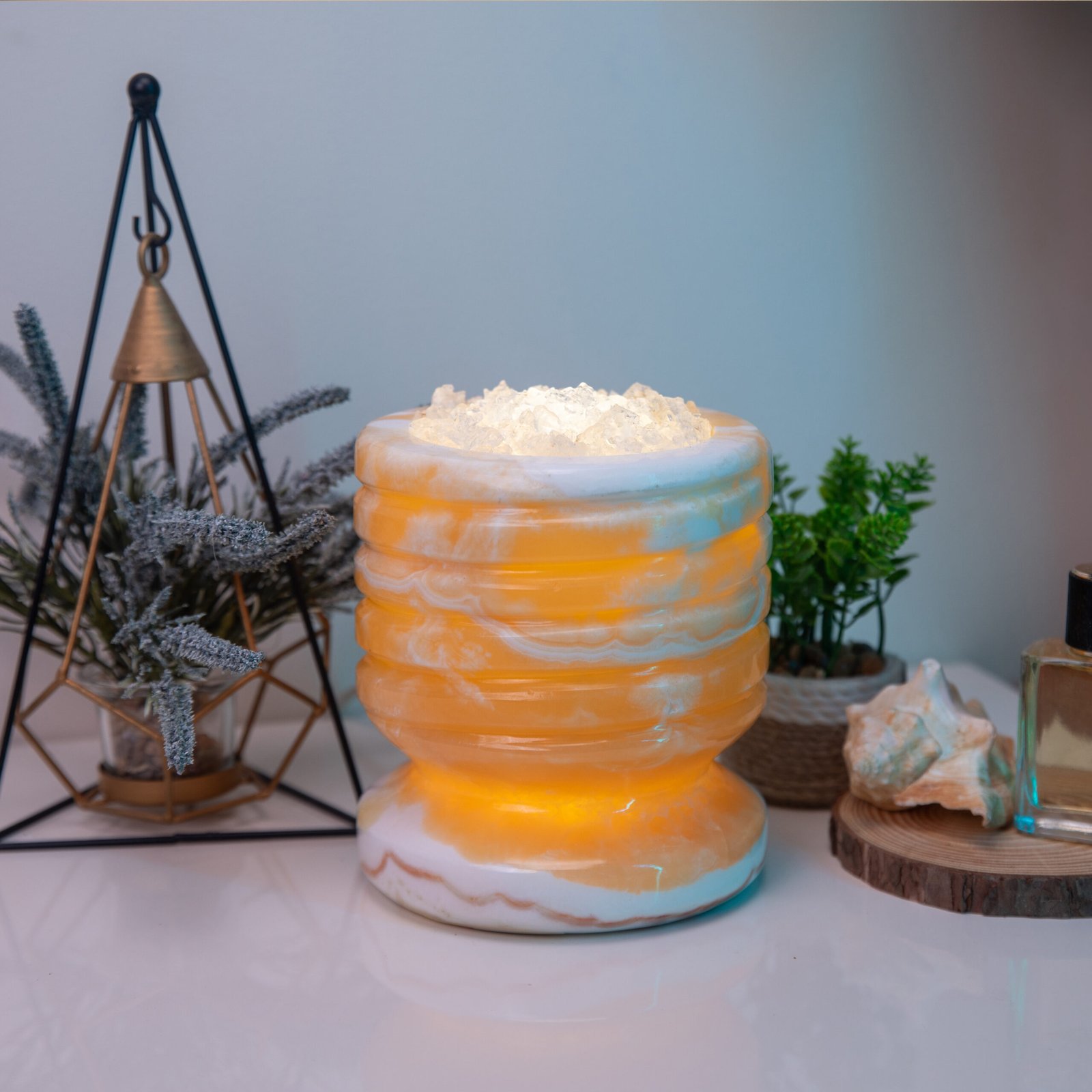 تجربة حسّية لا مثيل لها؛ قطعة ديكور فريدة من خامات طبيعية، مصنوعة يدويًا من صخور الجبال وكريستال الملح الصخري، بضوءٍ دافئ وهادئ. يُضاف العطر مباشرة على أطراف الملح لينساب بلطف في المكان، وتحمل عناصر أيونية طبيعية تمنح إحساسًا بالهدوء والتوازن وسط الأجهزة الحديثة.