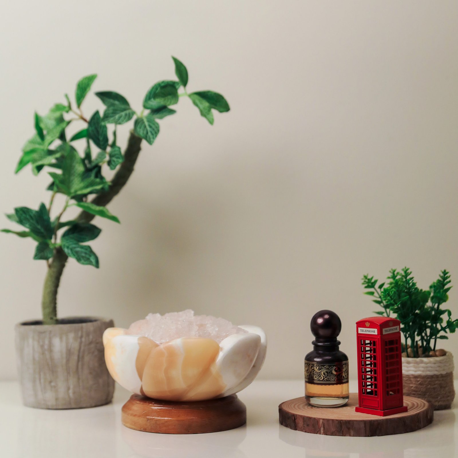 تجربة حسّية لا مثيل لها؛ قطعة ديكور فريدة من خامات طبيعية، مصنوعة يدويًا من صخور الجبال وكريستال الملح الصخري، بضوءٍ دافئ وهادئ. يُضاف العطر مباشرة على أطراف الملح لينساب بلطف في المكان، وتحمل عناصر أيونية طبيعية تمنح إحساسًا بالهدوء والتوازن وسط الأجهزة الحديثة.