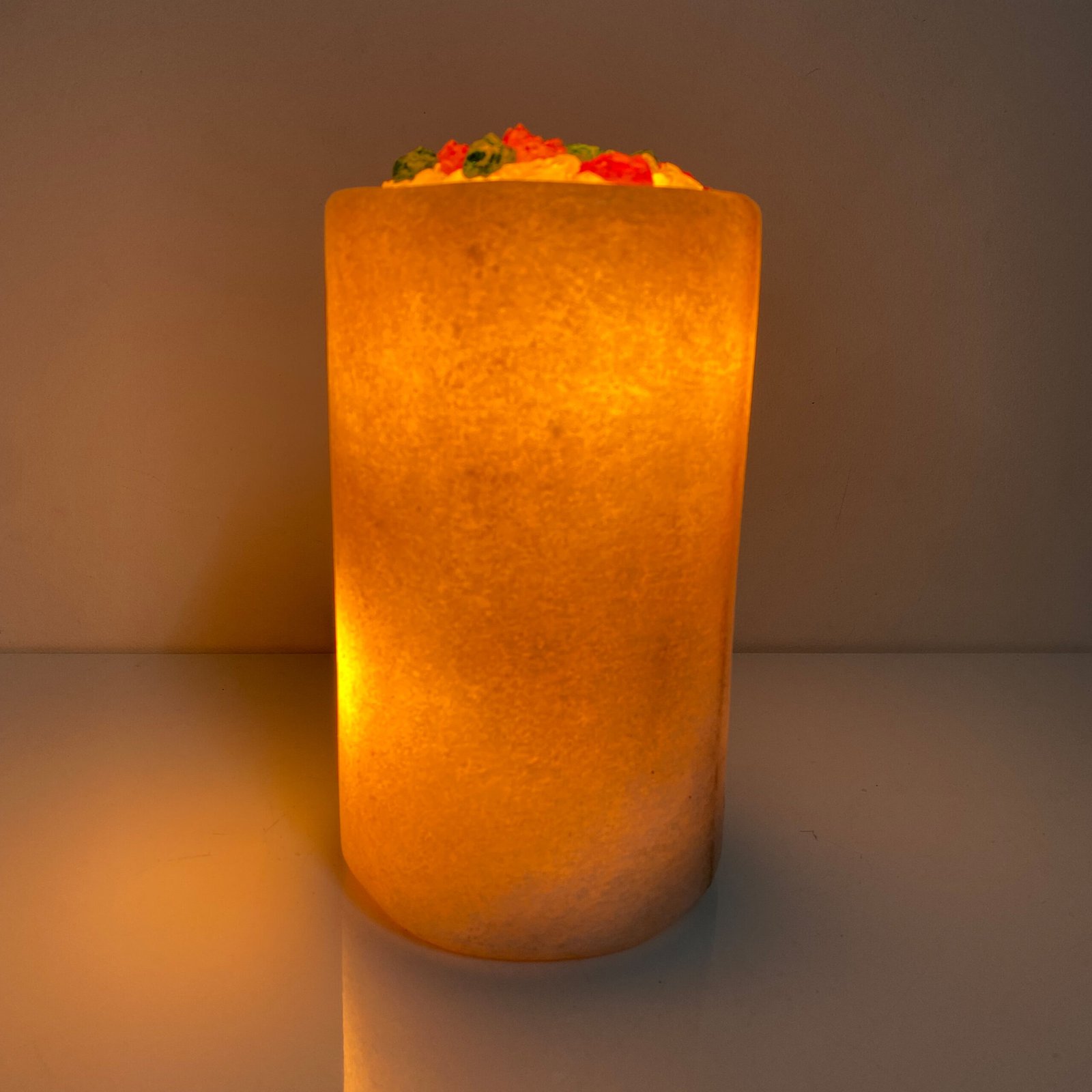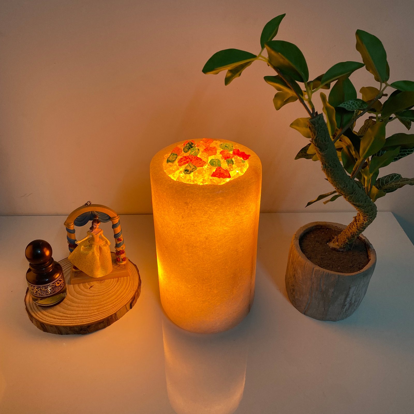 A state beyond mere presence; a unique décor piece made from natural rock salt, featuring a warm light and a gentle glow. Fragrance is applied to its sides, softly flowing to the surroundings and creating a sense of calm and comfort.