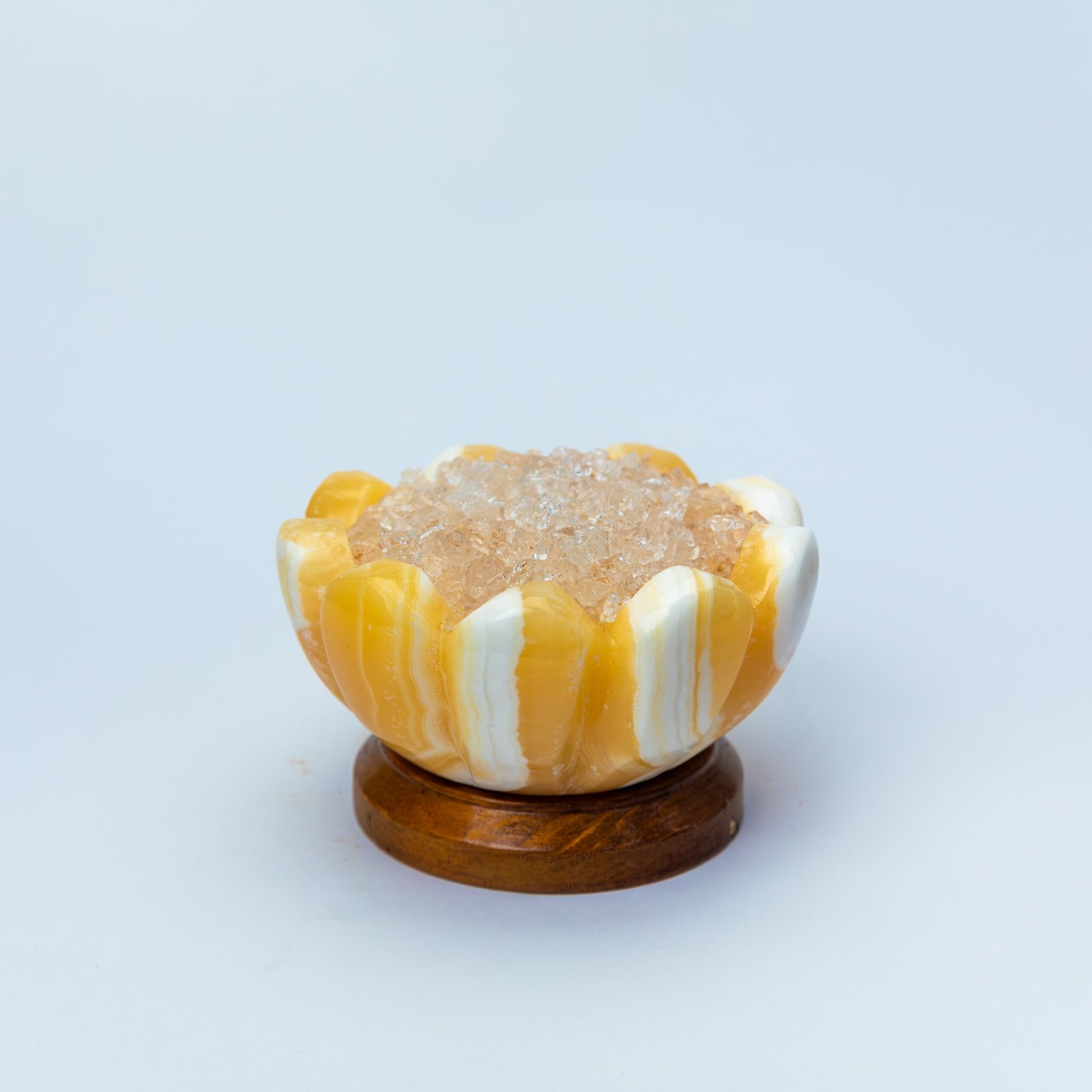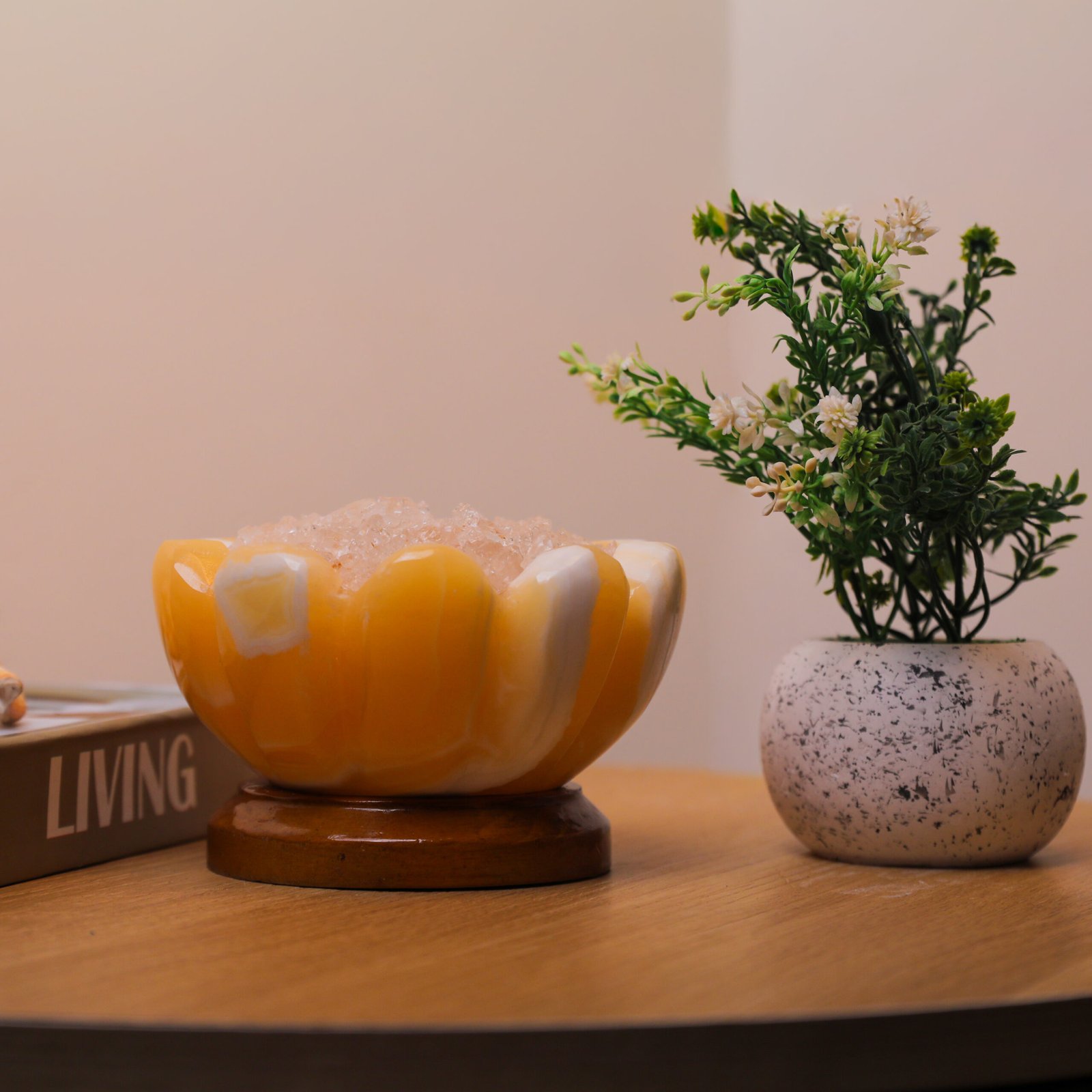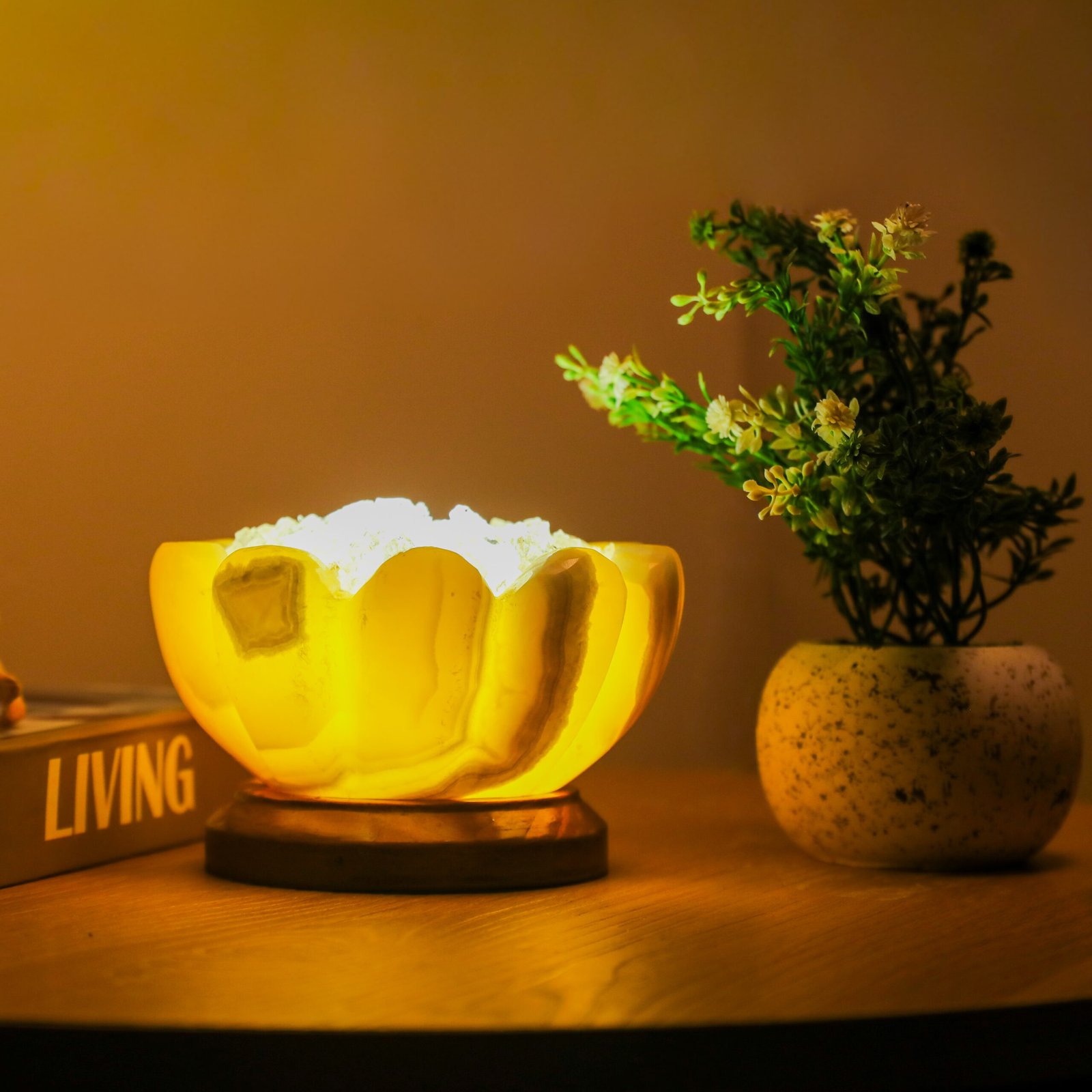 A sensory experience like no other; a unique décor piece made from natural materials, handcrafted from mountain stone and rock salt crystal, featuring a warm and calming glow. Fragrance is applied directly to the edges of the salt, gently diffusing into the space, while naturally occurring ionic elements create a sense of calm and balance amid modern devices.