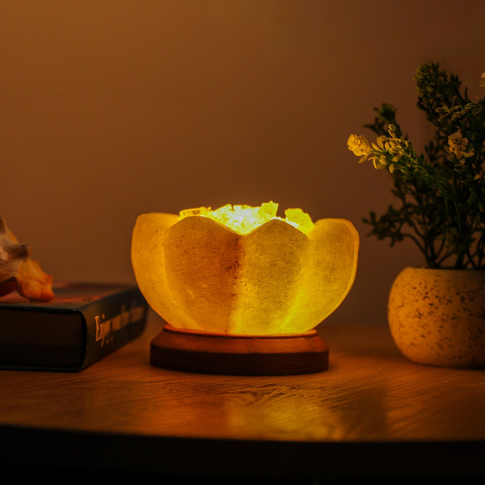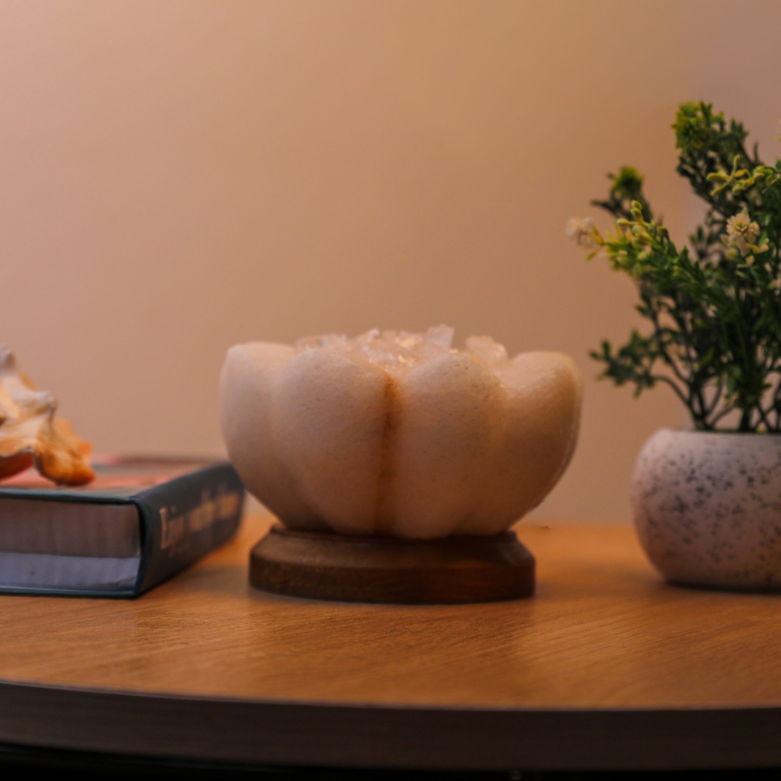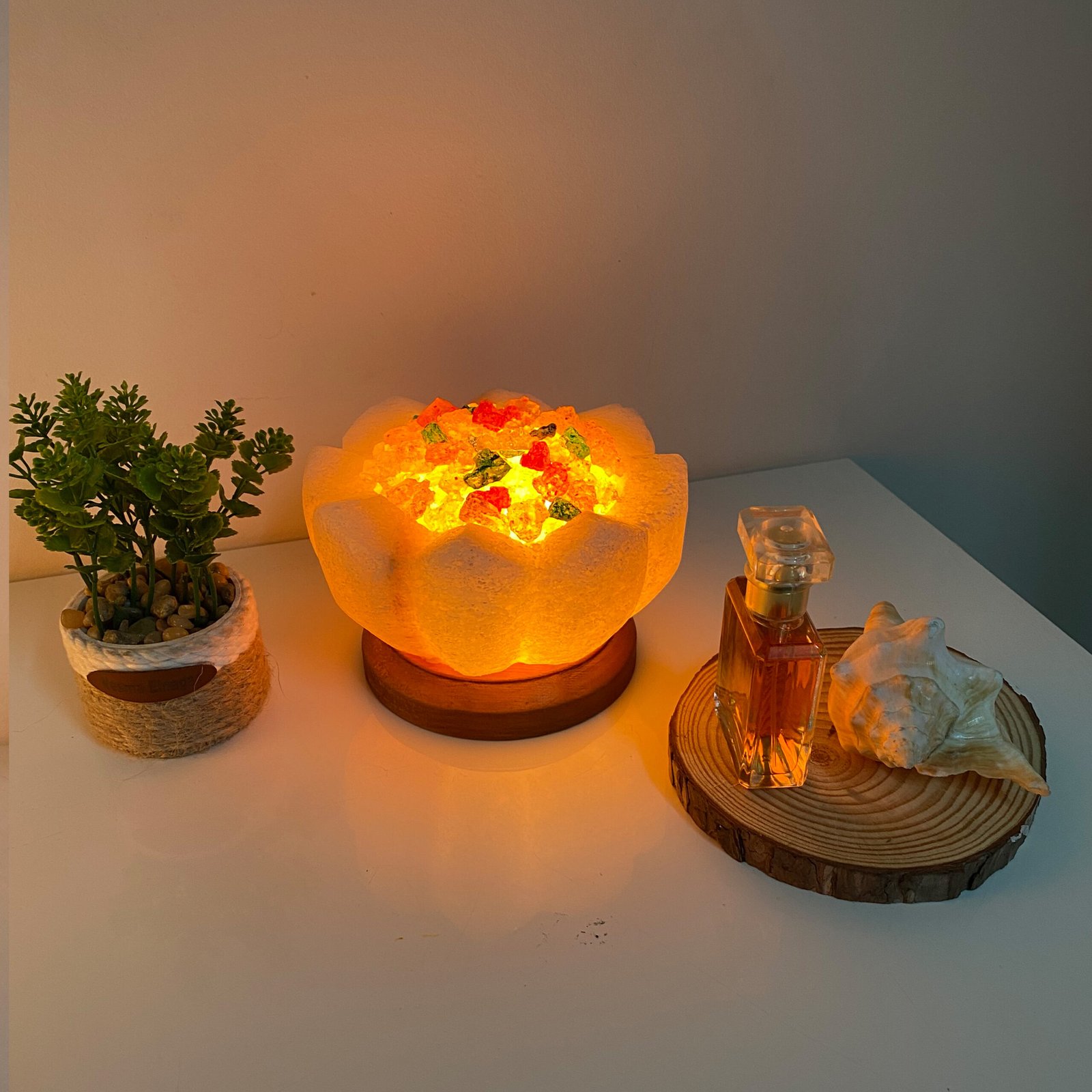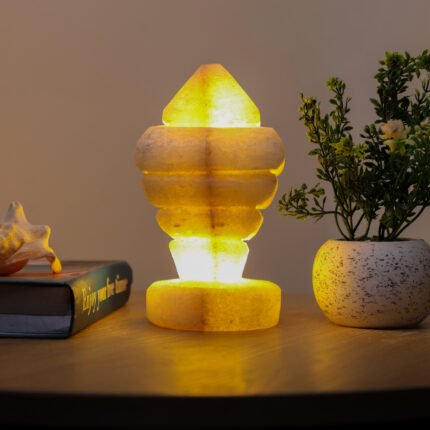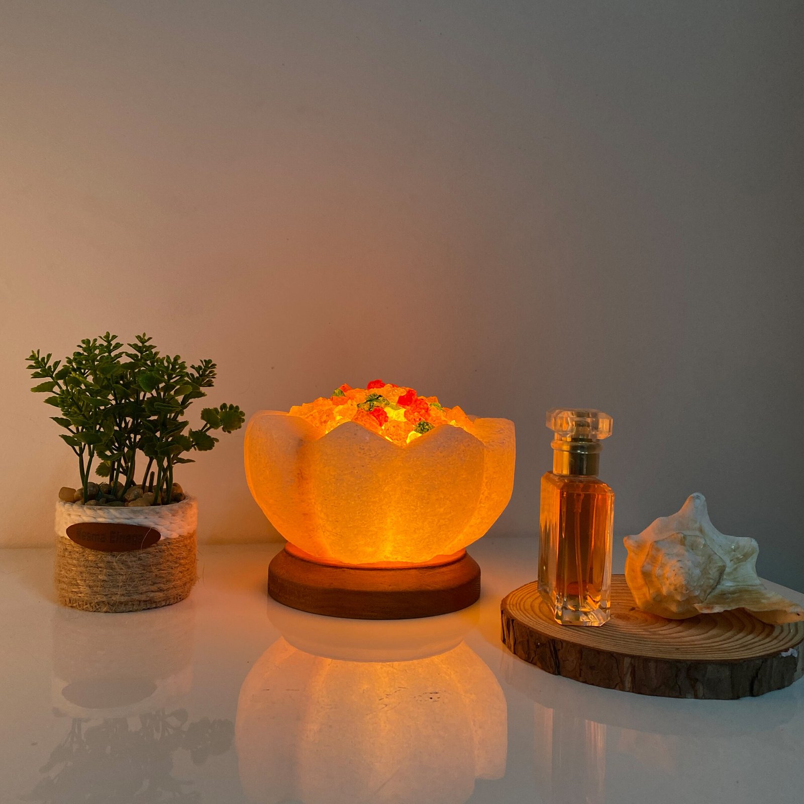 A state beyond mere presence; a unique décor piece made from natural rock salt, featuring a warm light and a gentle glow. Fragrance is applied to its sides, softly flowing to the surroundings and creating a sense of calm and comfort.