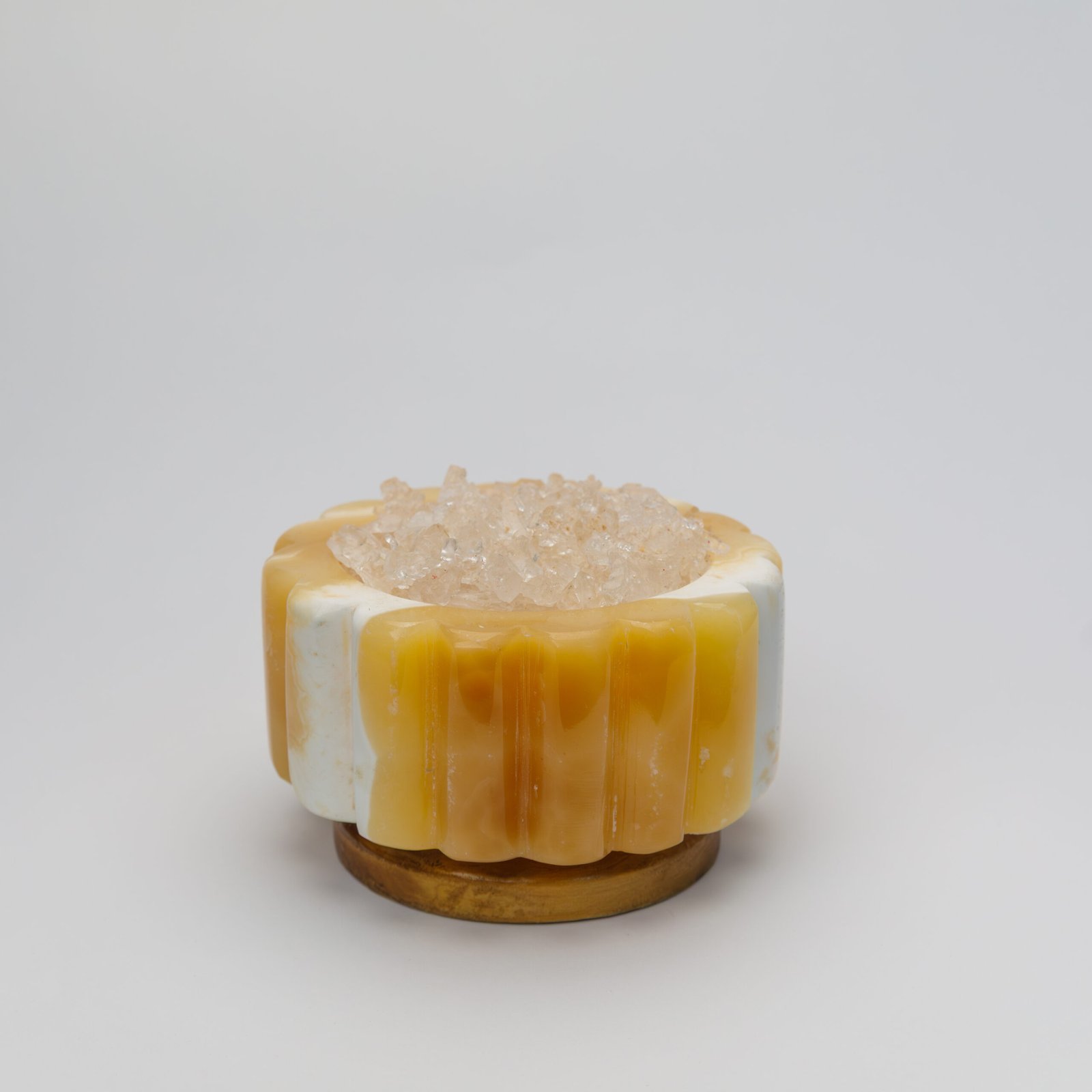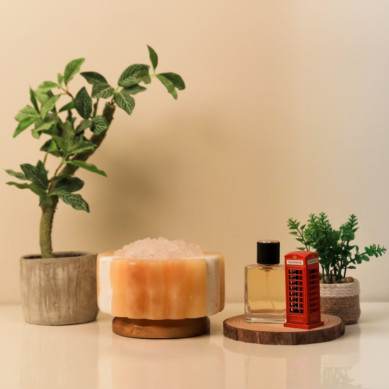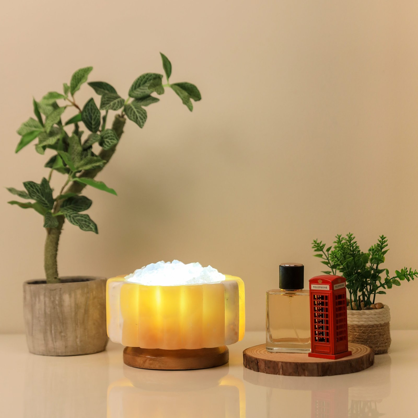 A sensory experience like no other; a unique décor piece made from natural materials, handcrafted from mountain stone and rock salt crystal, featuring a warm and calming glow. Fragrance is applied directly to the edges of the salt, gently diffusing into the space, while naturally occurring ionic elements create a sense of calm and balance amid modern devices.