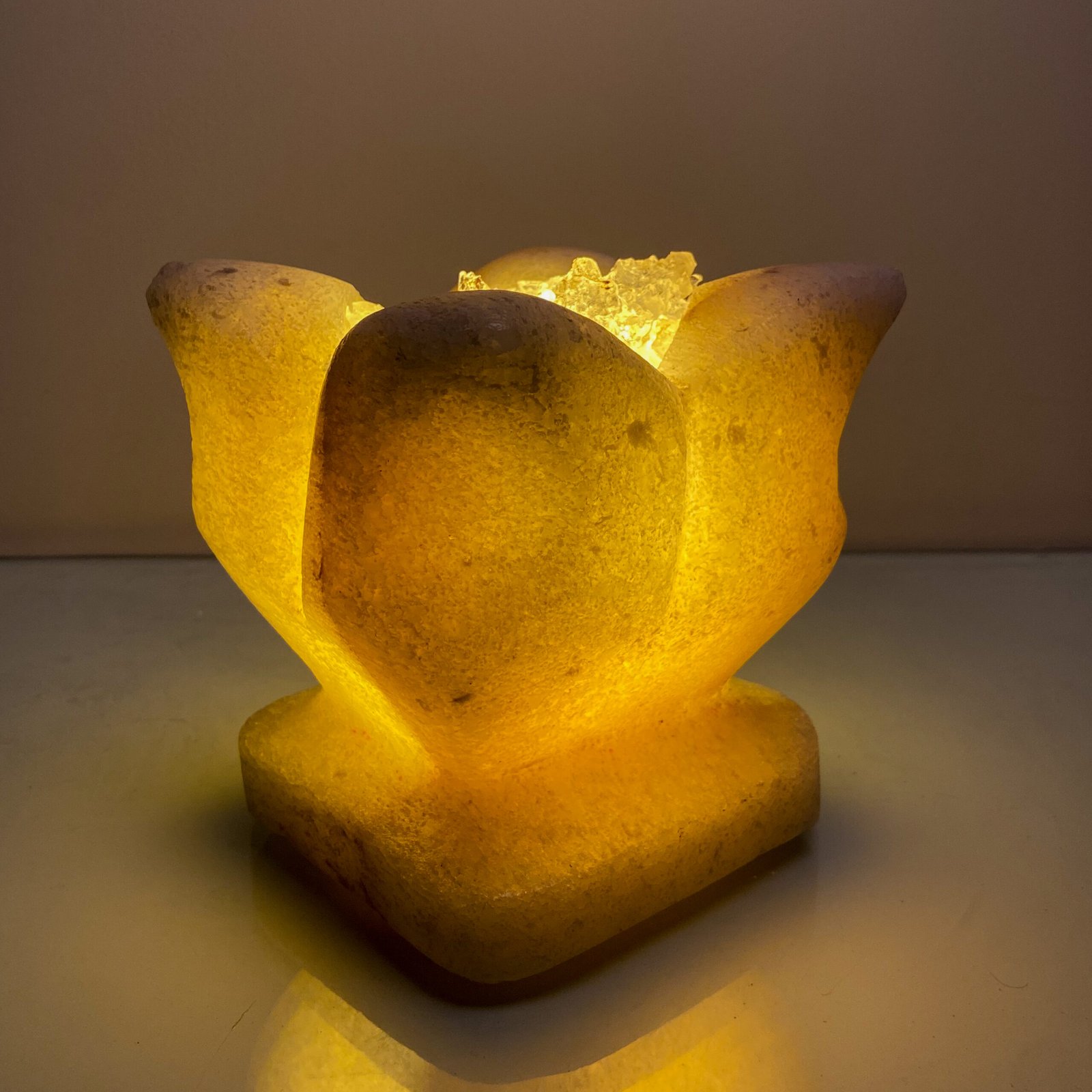 A state beyond mere presence; a unique décor piece made from natural rock salt, featuring a warm light and a gentle glow. Fragrance is applied to its sides, softly flowing to the surroundings and creating a sense of calm and comfort.