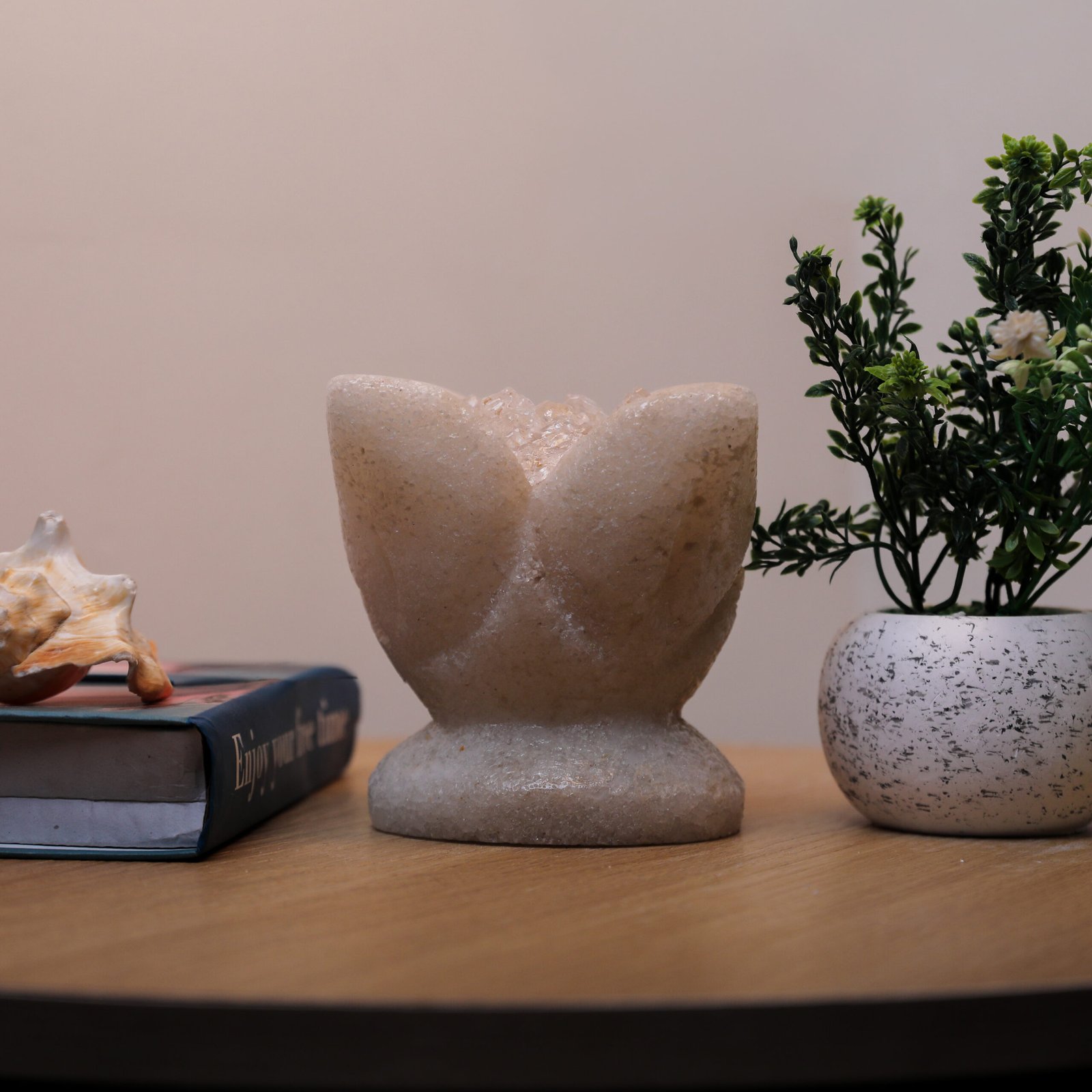 A state beyond mere presence; a unique décor piece made from natural rock salt, featuring a warm light and a gentle glow. Fragrance is applied to its sides, softly flowing to the surroundings and creating a sense of calm and comfort.