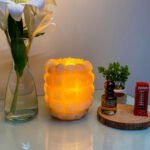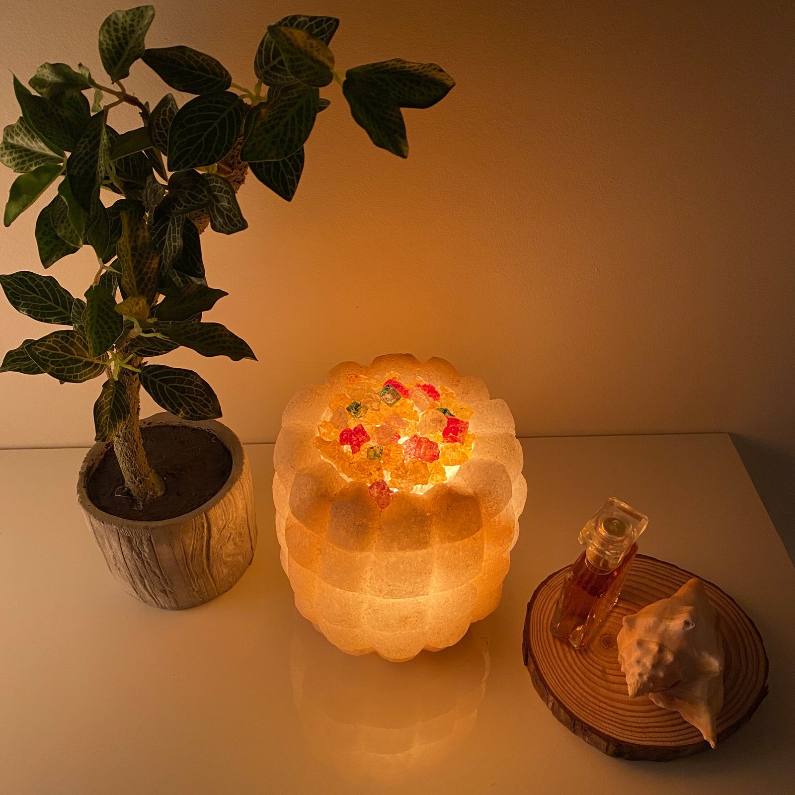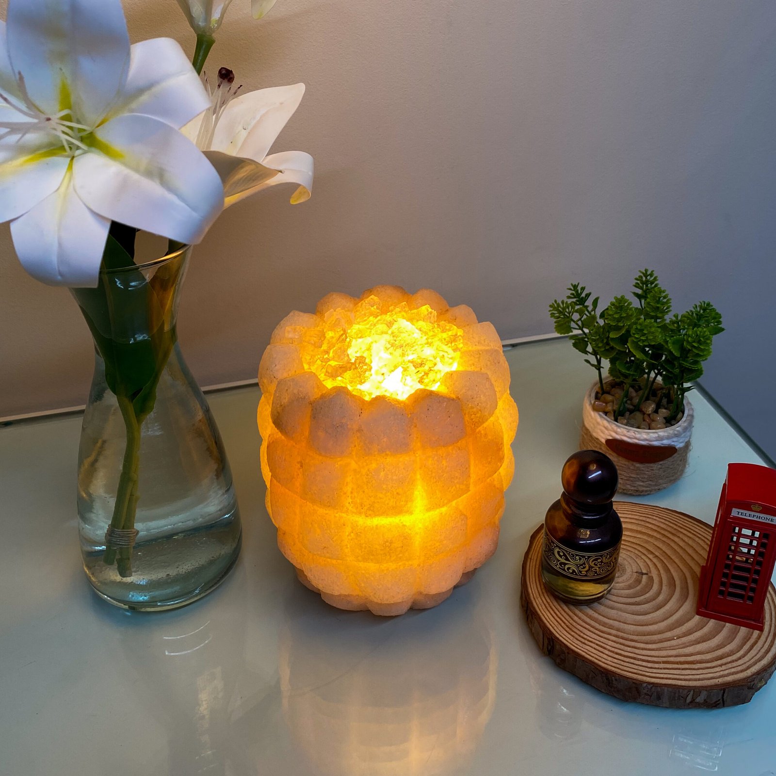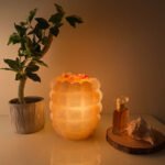A state beyond mere presence; a unique décor piece made from natural rock salt, featuring a warm light and a gentle glow. Fragrance is applied to its sides, softly flowing to the surroundings and creating a sense of calm and comfort.