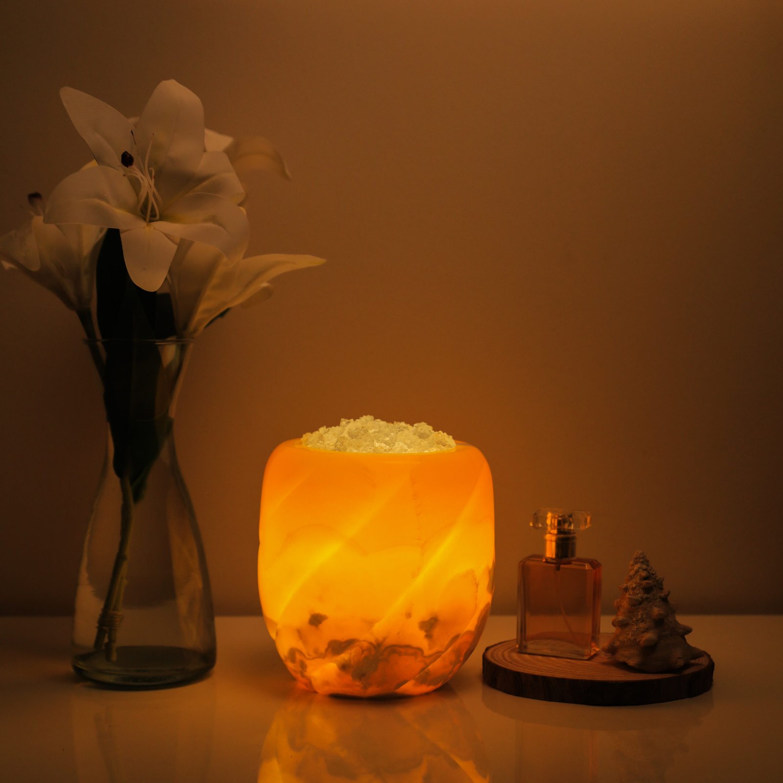 A sensory experience like no other; a unique décor piece made from natural materials, handcrafted from mountain stone and rock salt crystal, featuring a warm and calming glow. Fragrance is applied directly to the edges of the salt, gently diffusing into the space, while naturally occurring ionic elements create a sense of calm and balance amid modern devices.